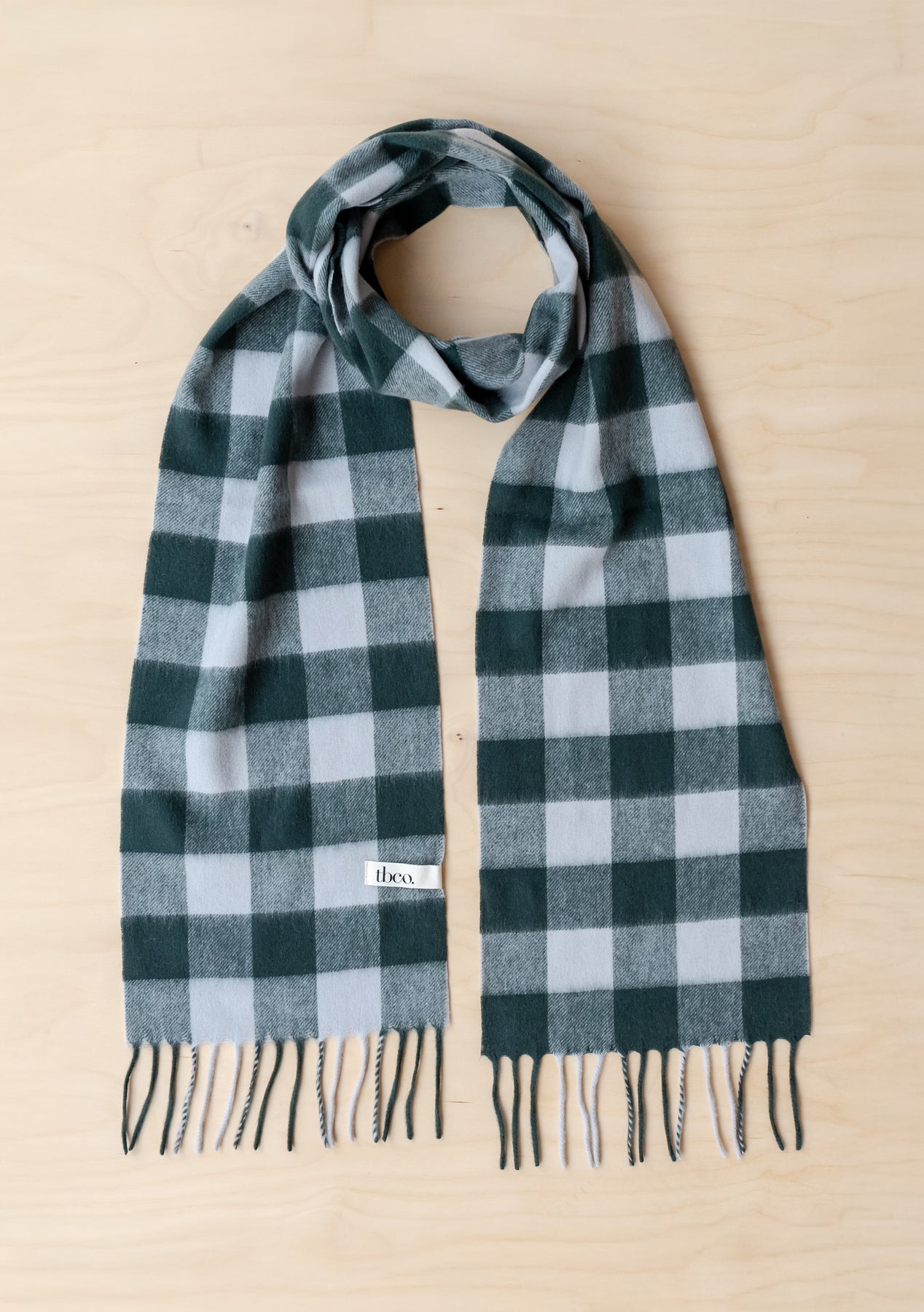 Personalised lambswool scarves including TBCo Lambswool Skinny Scarf in Berry Gingham with fringed edges on wooden surface