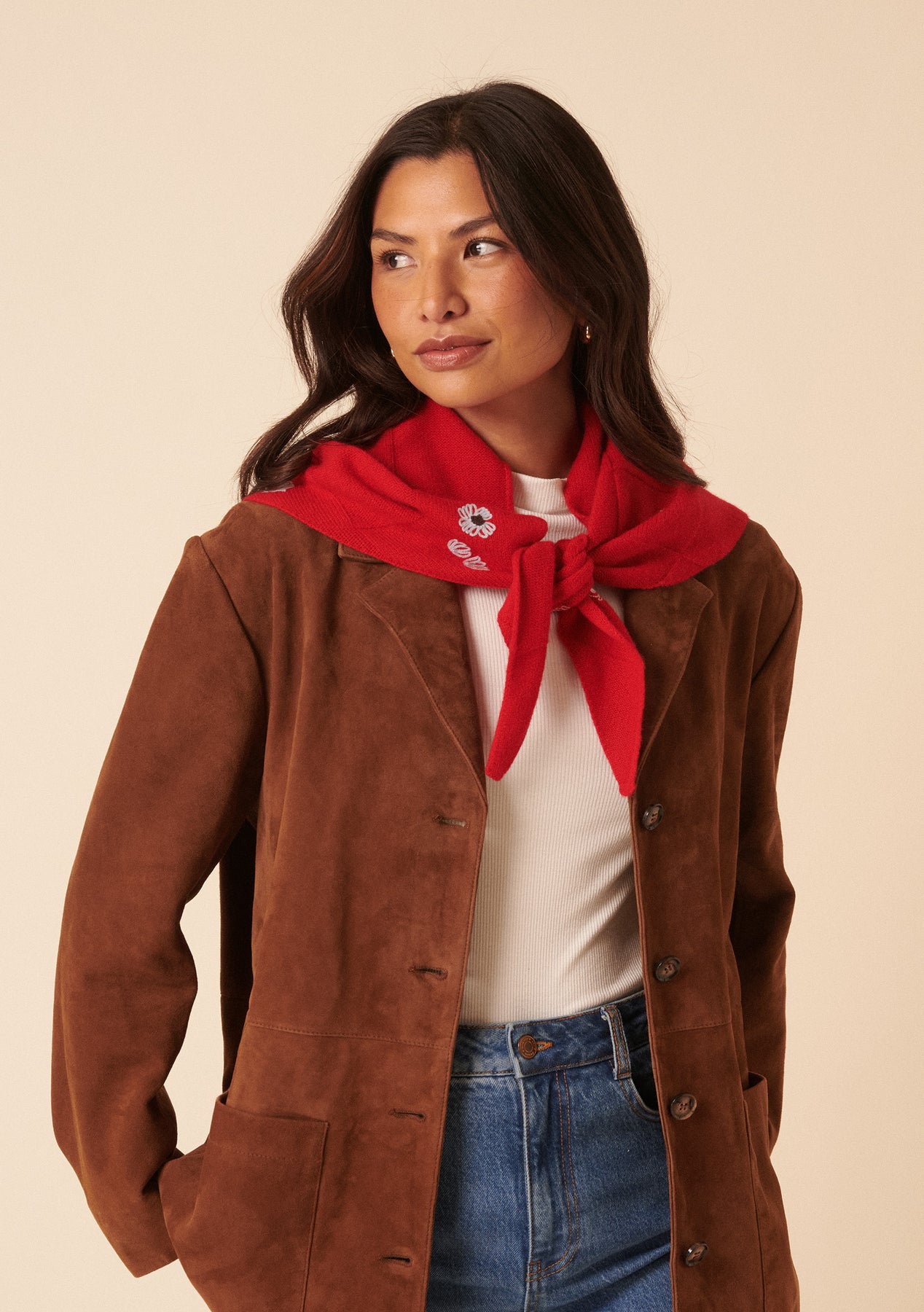 Our best-selling triangle scarf is back, this time with whimsical embroidery for a high-impact finish. This red design is knitted from lightweight and super soft merino wool with light blue floral embroidery detail. It can be tied multiple ways for endless styling options and is the perfect finishing touch you'll reach for time and time again. Read more on our blog here.
