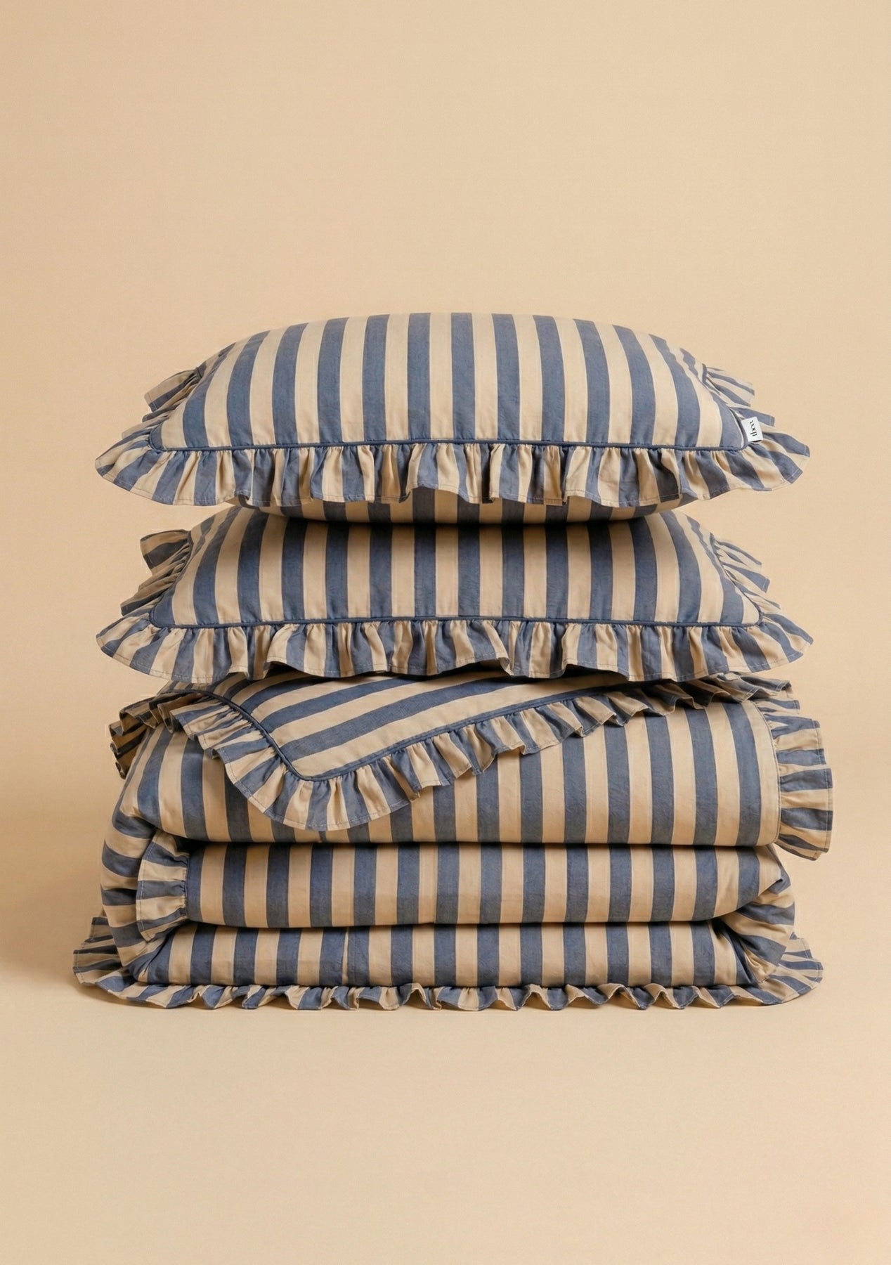 Instantly upgrade your bedroom with this navy blue and almond bedding set, featuring a bold striped duvet cover with delicate ruffled edges and two matching pillowcases. The cotton is skin-friendly and breathable, ensuring a peaceful night's sleep. Best paired with cosy evenings and slow mornings. Dust bag included for easy storage.