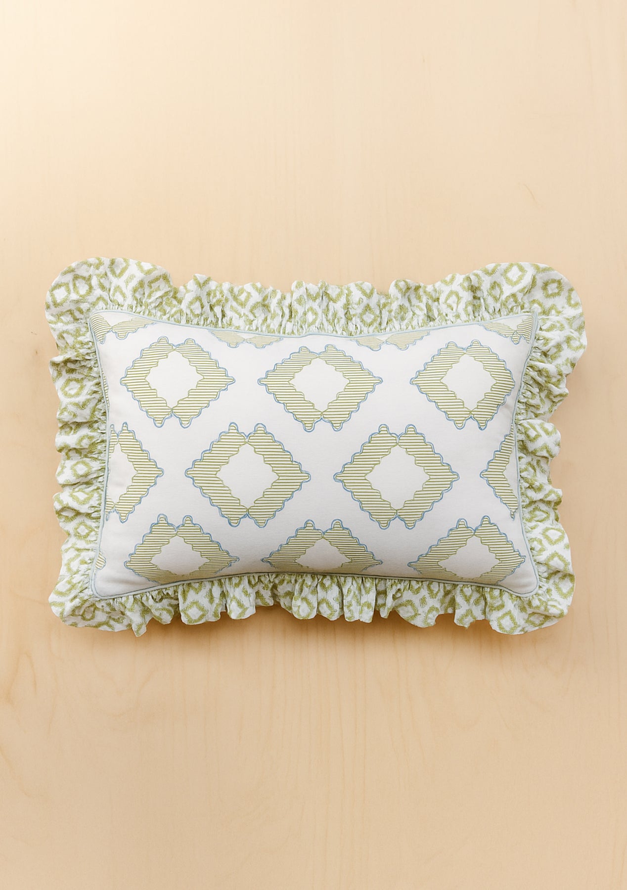 TBCo Cotton Duvet Cover & Pillowcases Set in Green Diamond with delicate ruffled trim and pale geometric diamond print