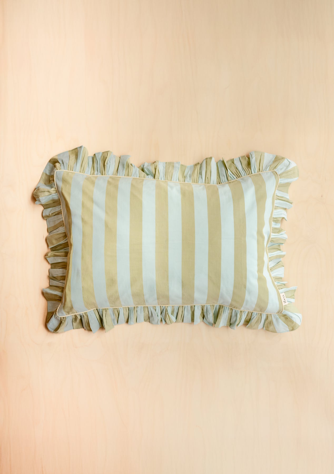 Verleihen Sie Ihrem Schlafzimmer mit diesem mintgrünen und blauen Bettwäsche-Set im Handumdrehen ein neues Aussehen. Das Set besteht aus einem gestreiften Bettbezug mit Rüschensaum und kontrastierender gelber Paspelierung sowie zwei passenden Kissenbezügen. Die hautfreundliche und atmungsaktive Baumwolle sorgt für einen erholsamen Schlaf. Ideal für gemütliche Abende und entspannte Morgenstunden. Ein Staubbeutel zur einfachen Aufbewahrung ist im Lieferumfang enthalten.