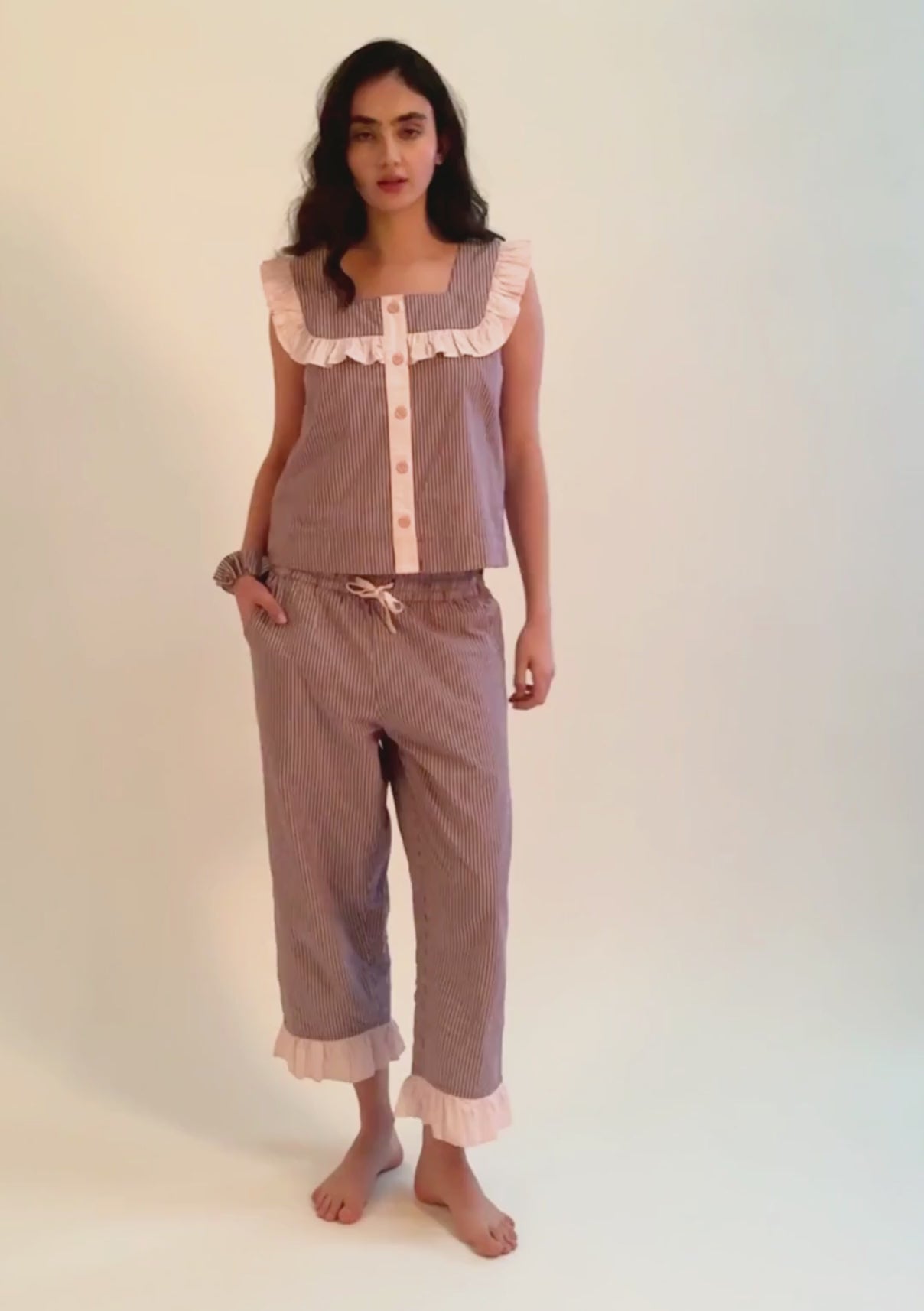 Kurze Baumwollpyjamas Burgunderfarbene Streifenrüsche