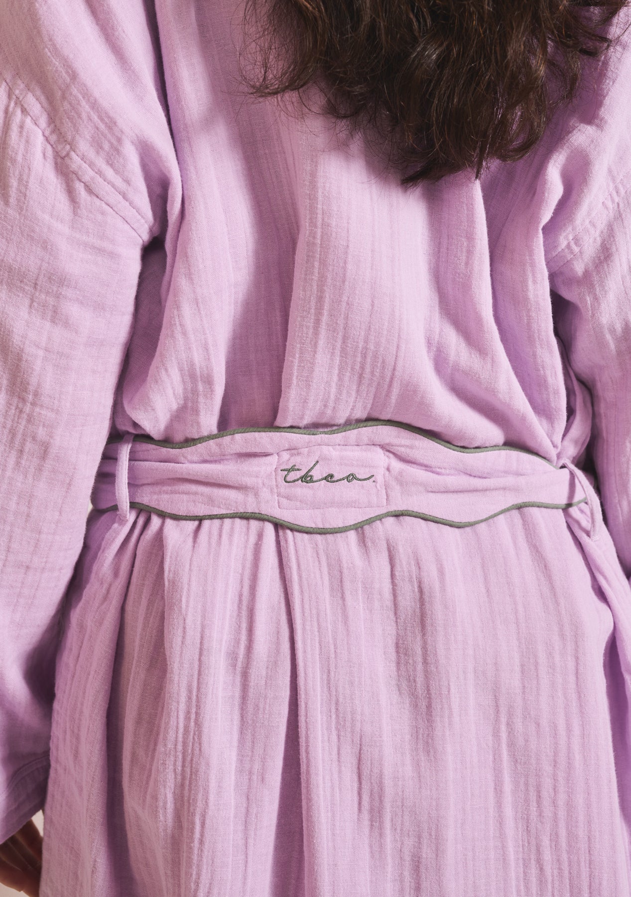 Dieser lilafarbene Morgenmantel aus 100 % hochwertiger Baumwollgaze ist angenehm weich und atmungsaktiv. Die lockere Passform und die geschwungenen Kanten machen ihn zu einem eleganten und zugleich komfortablen Begleiter – perfekt zum Entspannen. Tragen Sie ihn mit dem passenden Pyjama oder solo.