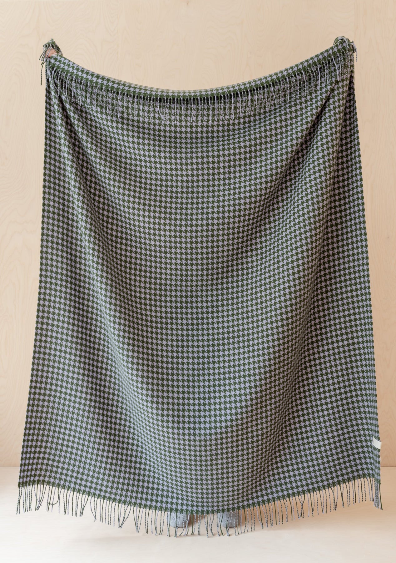 TBCo Lambswool Blanket in Olive Houndstooth pattern displayed with fringe detail against neutral background