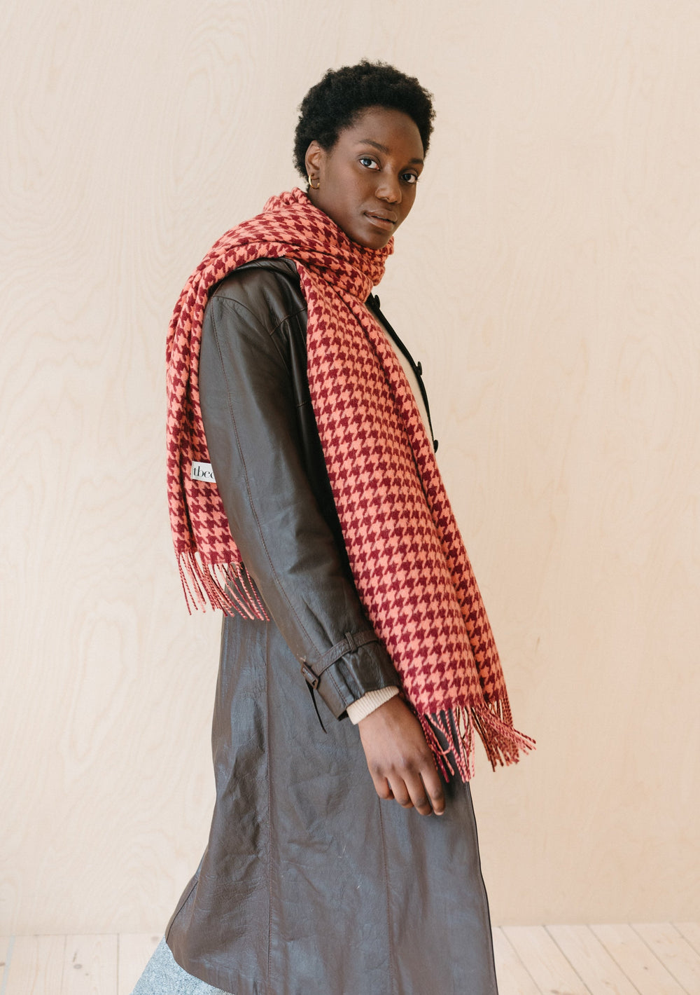 Présentant un mélange de tons de baies dans un design pied-de-poule moderne, cette écharpe frangée en laine d'agneau offre un cocon de chaleur. Attachez-le, enveloppez-le ou drapez-le pour un style polyvalent ou emportez-le avec vous comme couverture de voyage. Les frisures uniques des brins individuels de laine d'agneau créent des poches d'air qui retiennent la chaleur tout en repoussant l'humidité, vous gardant au chaud lorsque vous avez frais et au frais lorsque vous avez chaud pour une tenue d'hiver plus confortable. En plus d'être un textile naturellement isolant, respirant et hypoallergénique, il est magnifiquement doux. Il n'y a pas beaucoup mieux que ça.