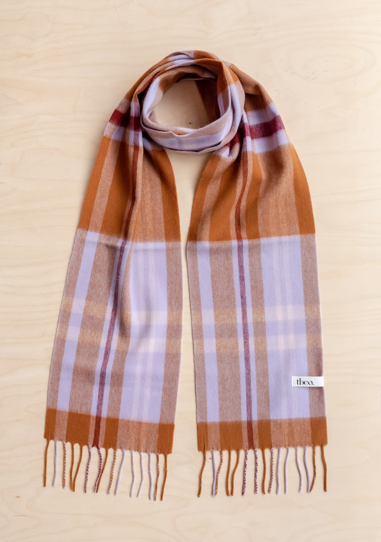 Personalised lambswool scarves including TBCo Lambswool Skinny Scarf in Berry Gingham with fringed edges on wooden surface